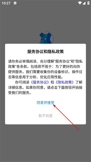 1、阅读服务协议和隐私政策后,点击同意并接受,进入亦通云的登录页面。