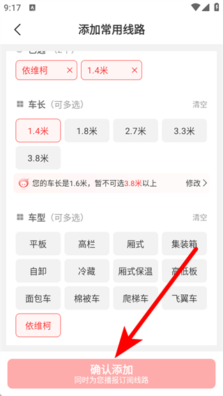 3、在界面选择车长等信息后,点击确认添加,完成常用线路订阅。