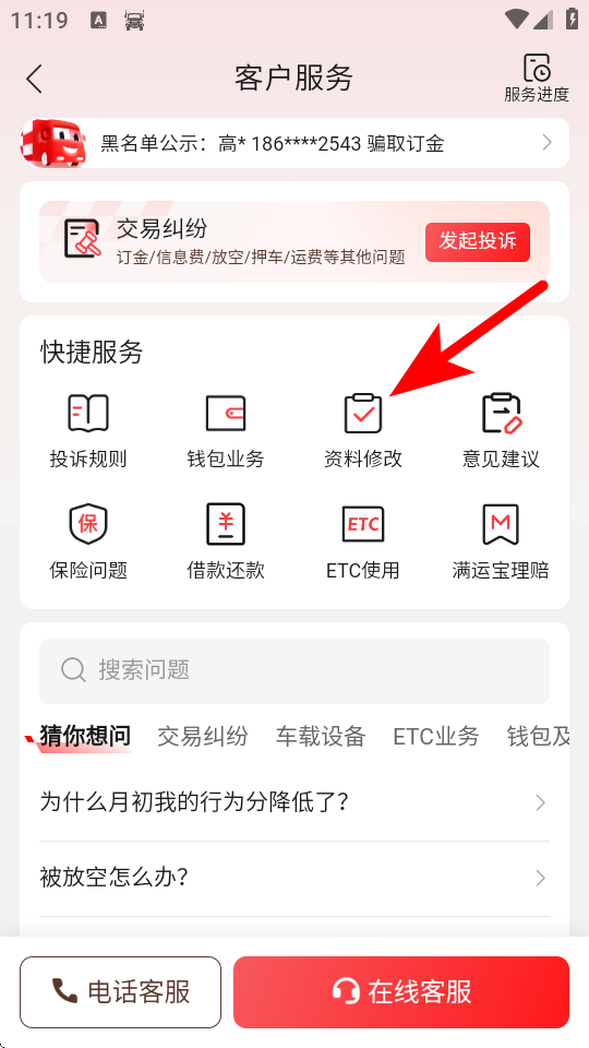 2、在客户服务功能的页面,点击资料修改,进入资料修改选项页面。