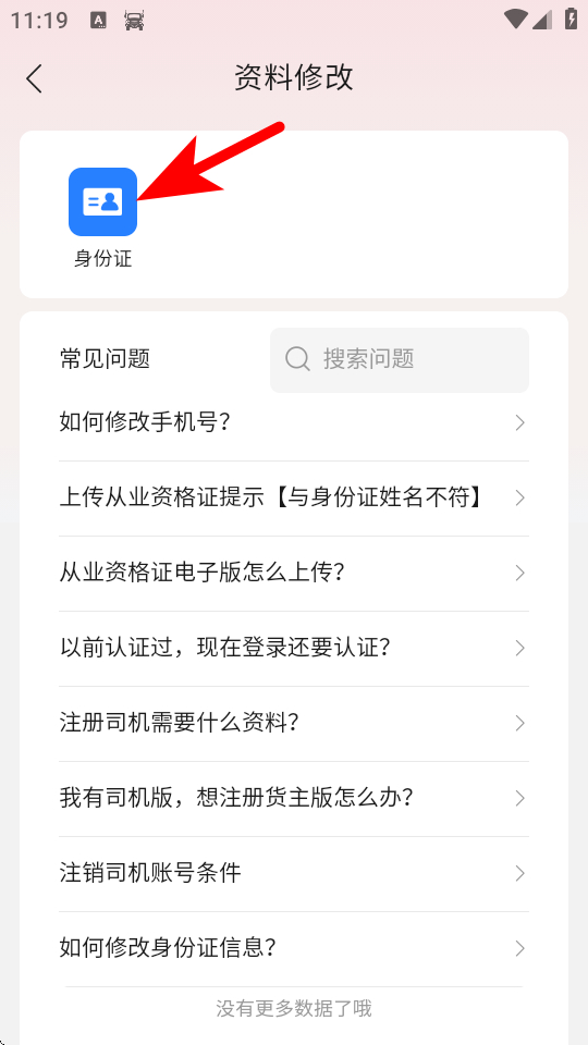 3、在资料修改选项页面,点击身份证,进入司机实名认证页面。