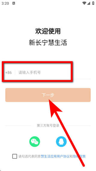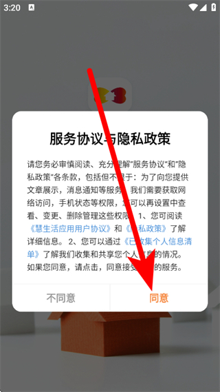1、打开新长宁慧生活,在服务协议与隐私政策弹窗,点击同意。