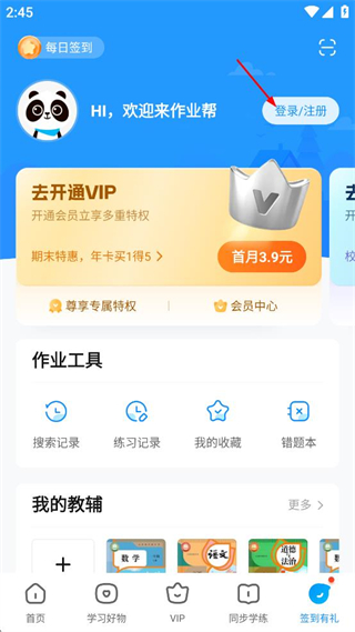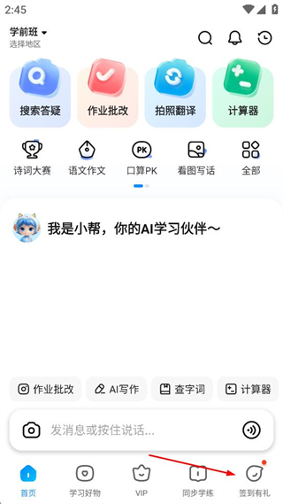 1、打开作业帮主界面,找到底部的签到有礼选项,点击该选项进入签到有礼页面。