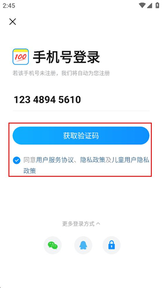 4、勾选同意相关协议的选项,点击获取验证码按钮,等待接收验证码完成登录。