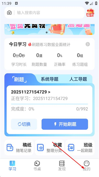 1、在学习页面,点击底部的我的选项,进入个人页面。