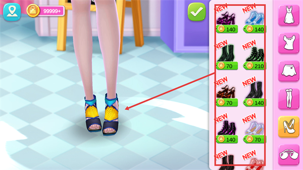 2、在鞋品选择界面,右侧【鞋子】选项,挑合适款式后点击确认,完成脚部搭配的细节调整。