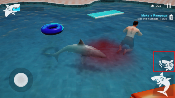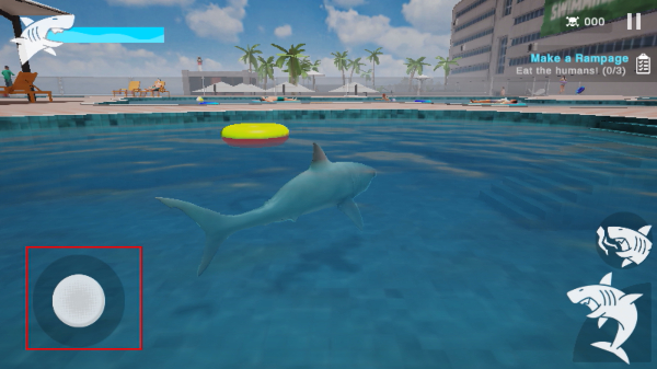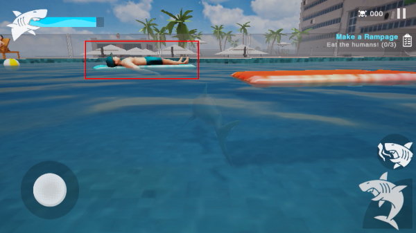 2、进入关卡后,用【移动按钮】操控鲨鱼在泳池内游动,靠近目标人类准备发起攻击。