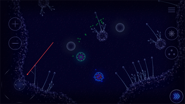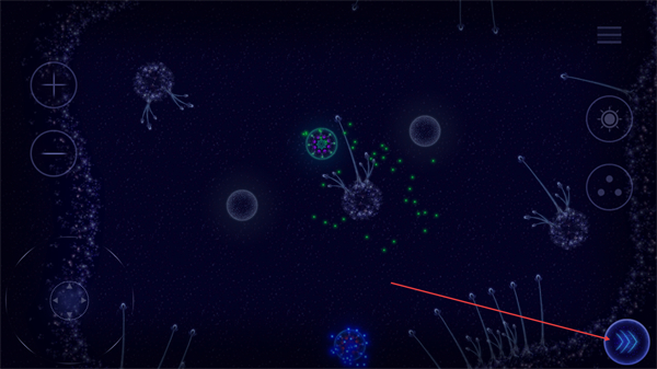 2、点击右侧按钮,控制细胞释放绿点资源,与敌方细胞互动。