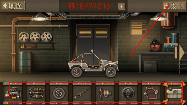 1、在车库界面选择发动机、轮胎等配件组装战车,点击右上角出发进入关卡。