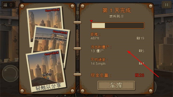 4、燃料耗尽后会显示当天结算界面,查看距离、击杀数等数据,点击车库返回组装界面。