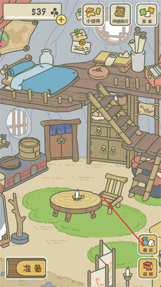 2、在小屋界面点击右下角的商店,可购买便当、护身符等道具。