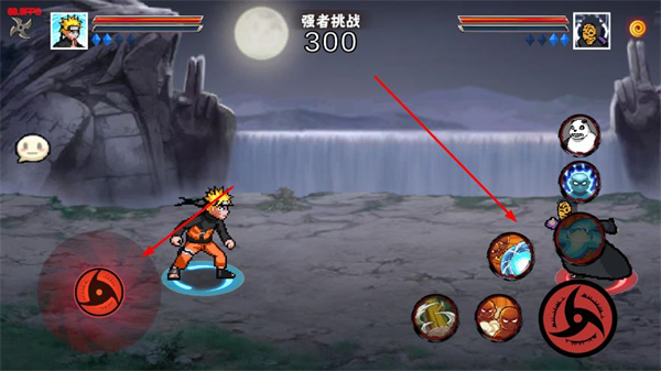 4、战斗中通过左侧摇杆控制角色移动,点击右侧的技能按钮释放忍术,击败强化后的BOSS以获取高分。
