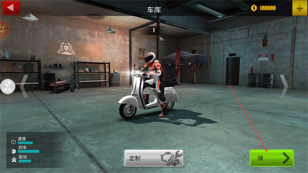1、在车库界面选择车辆后,点击骑按钮进入驾驶场景。