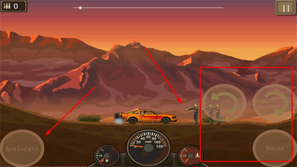 3、驾驶时通过左侧按钮加速,右侧按钮控制转向,撞击沿途僵尸推进关卡。