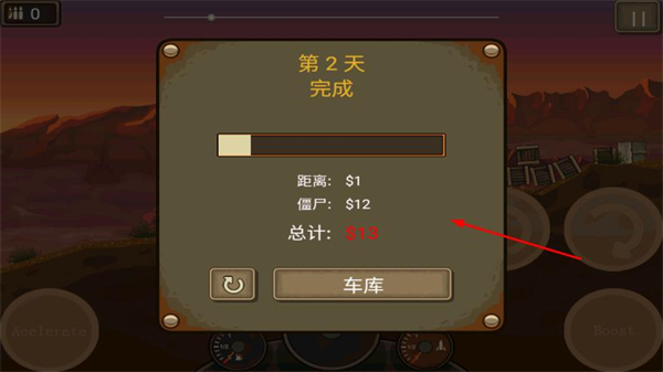 4、当日关卡完成后,查看结算的金币奖励,点击车库返回组装界面准备下一轮。
