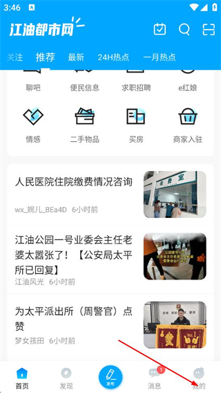 1、在江油都市网首页,点击底部的我的选项,进入个人页面。