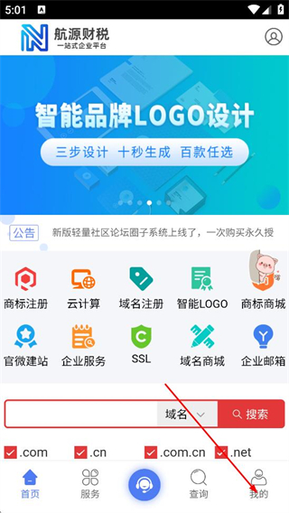 2、随后我们可以在航源财税APP首页,点击底部的我的选项,进入登录页面。