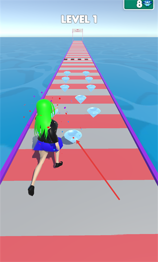 3、继续在【LEVEL-1】的路径上操控角色移动,收集沿途的钻石,收集时会出现彩色特效,钻石数量积累可优化关卡表现。