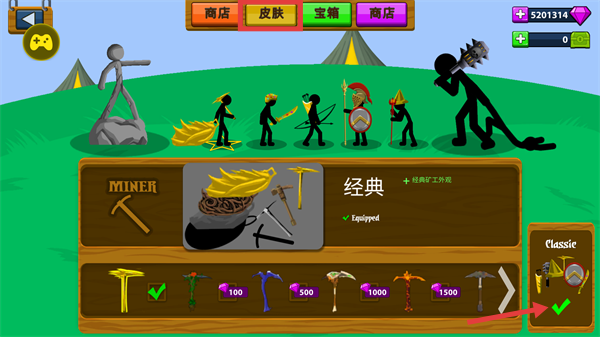 1、进入商店的【皮肤】界面,先查看【矿工】皮肤分类,当前已装备【经典】皮肤,可切换其他皮肤。