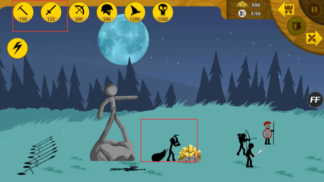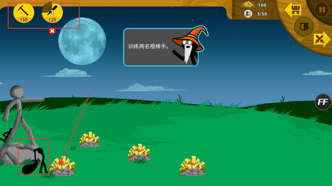 4、积累足够资源后,花费125金币训练棍棒手,组建战斗队伍,提升战斗能力,应对游戏挑战。