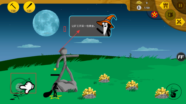 3、按照提示,指挥矿工开采黄金,获取资源,为后续训练单位、升级等操作积累资金。