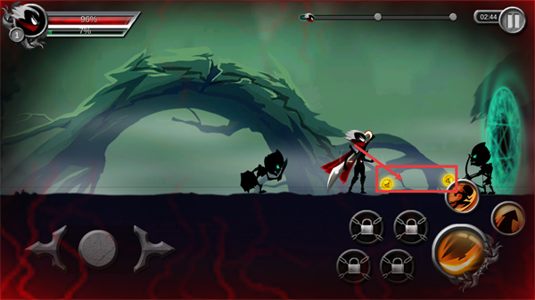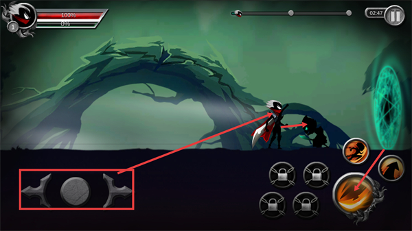2、战斗中通过左侧【左右移动按钮】操控角色位移,右侧【技能按钮】可释放攻击,同时留意左上角【生命值-100%】的状态。