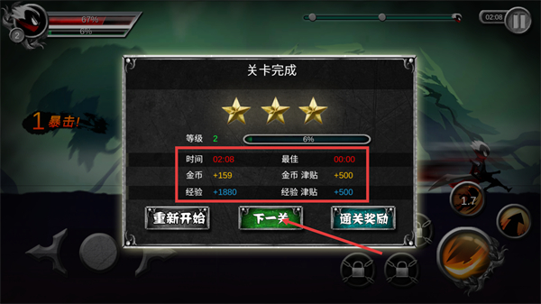 4、关卡完成后可获得【金币-+159】【经验-+1880】等奖励,达成三星评价后点击【下一关】按钮继续挑战。
