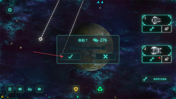 2、当舰船受损时,选择【修船?】选项,消耗资源点击确认,修复受损舰船恢复战力。