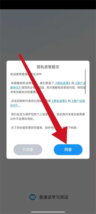 1、打开普通话考试,在弹窗中点击同意,进入首页。
