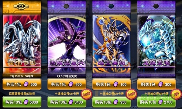 使用宝石购买卡包可以更为精准地收集心仪的卡组。无论是蕾雅卡包,还是战士集结,都能够快速获得该类卡牌,使得该卡组的战力成型。而龙族圣地卡包中包含了大量的龙族怪兽和地属性怪兽,更有超稀有UR卡“青眼白龙”登场,绝对值得偏爱这一卡组的玩家尝试。