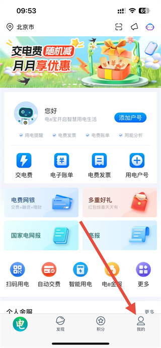 1、进入电e宝app主界面后,点击底部我的选项,进入个人页面。