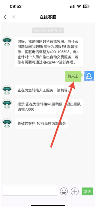 3、在在线客服界面,发送转人工信息,等待系统转接人工坐席,即可与人工客服沟通。