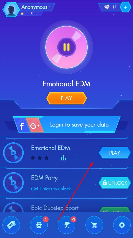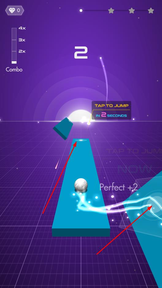 1、从入门的歌曲开始玩,学习点击控制弹力球的基本技巧,熟悉音键的出现规律,确保球不落地。