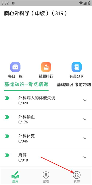 1、在胸心外科学题库页面点击底部我的选项,进入个人中心页面。