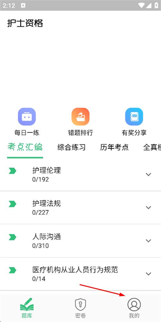 1、在护士资格题库页面点击底部我的选项,进入个人中心页面。