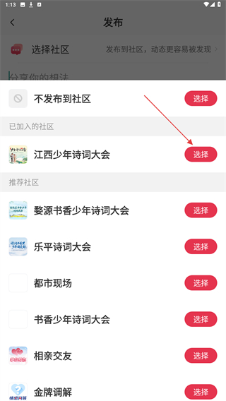 2、进入发布页面内,点击选择社区的功能按钮。