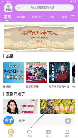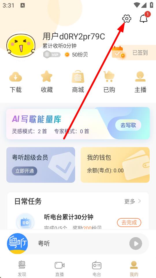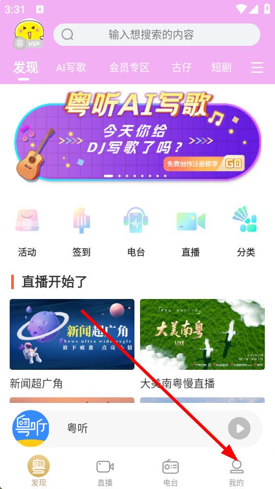 1、打开粤听APP,点击底部导航栏我的进入个人页面。