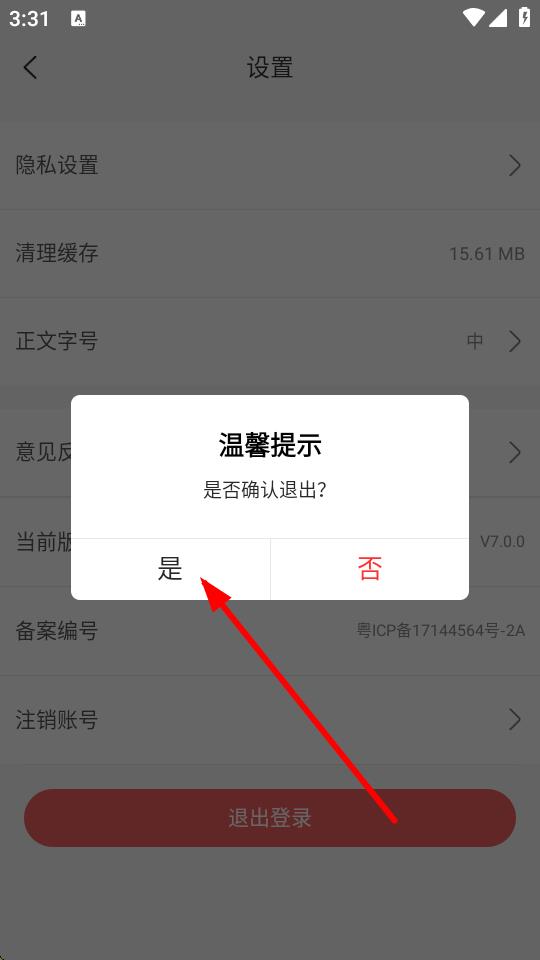 4、在弹出的温馨提示弹窗中,点击是,即可完成退出登录操作。