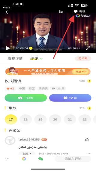 3、点击后展开相关功能,再点击右上角电视的功能按钮。