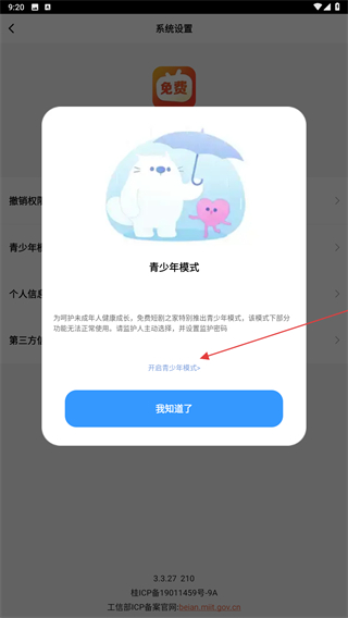 5、进入青少年模式的页面内,阅读后点击开启青少年模式即可。