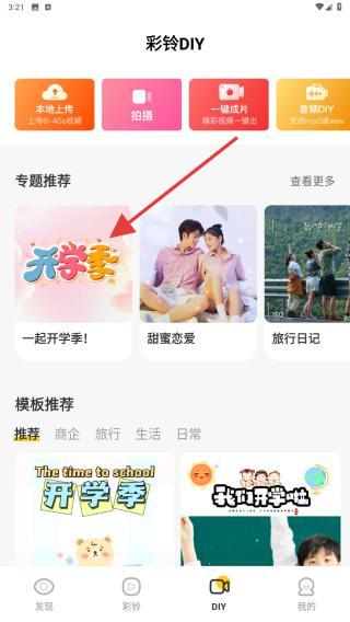 2、进入彩铃DIY的界面内,在专题推荐下,选择并点击你要剪辑的专题内容。