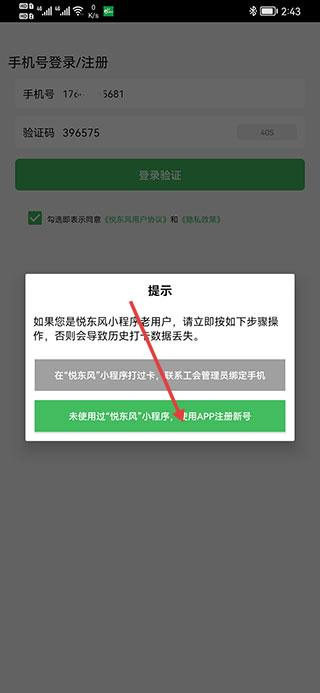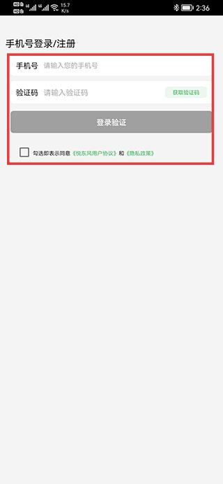 1、打开悦东风,输入手机号、获取并填写验证码,勾选同意提示后点击登录验证。