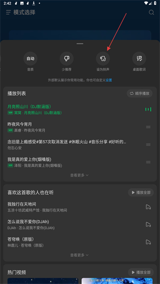 1、打开汽水音乐的歌曲播放界面,点击左上角的模式选择。