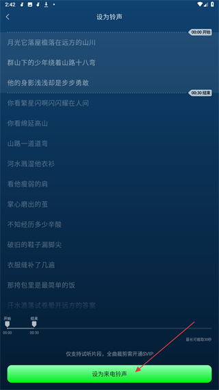 3、选择对应的音乐片段,再点击设为来电铃声按钮。