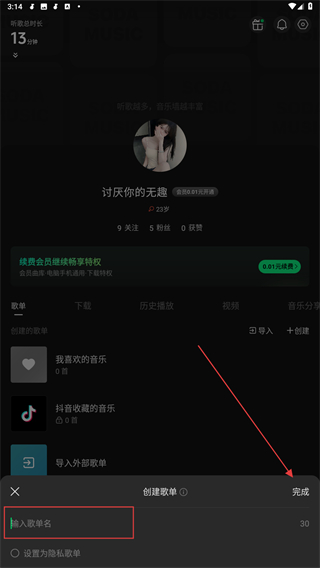 3、输入歌单名称后,再点击完成的按钮即可创建成功。