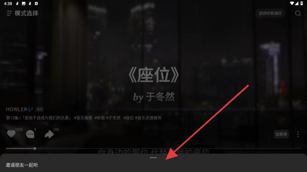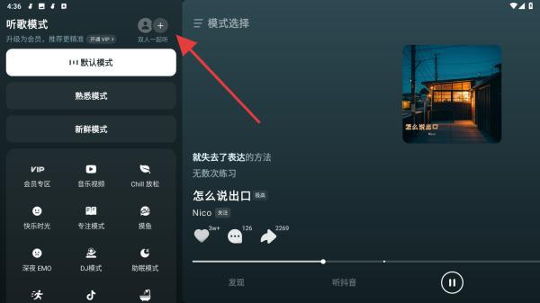 2、在弹出的听歌模式侧边栏中,点击带有+标识的加入一起听按钮。