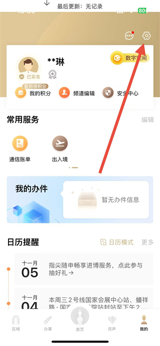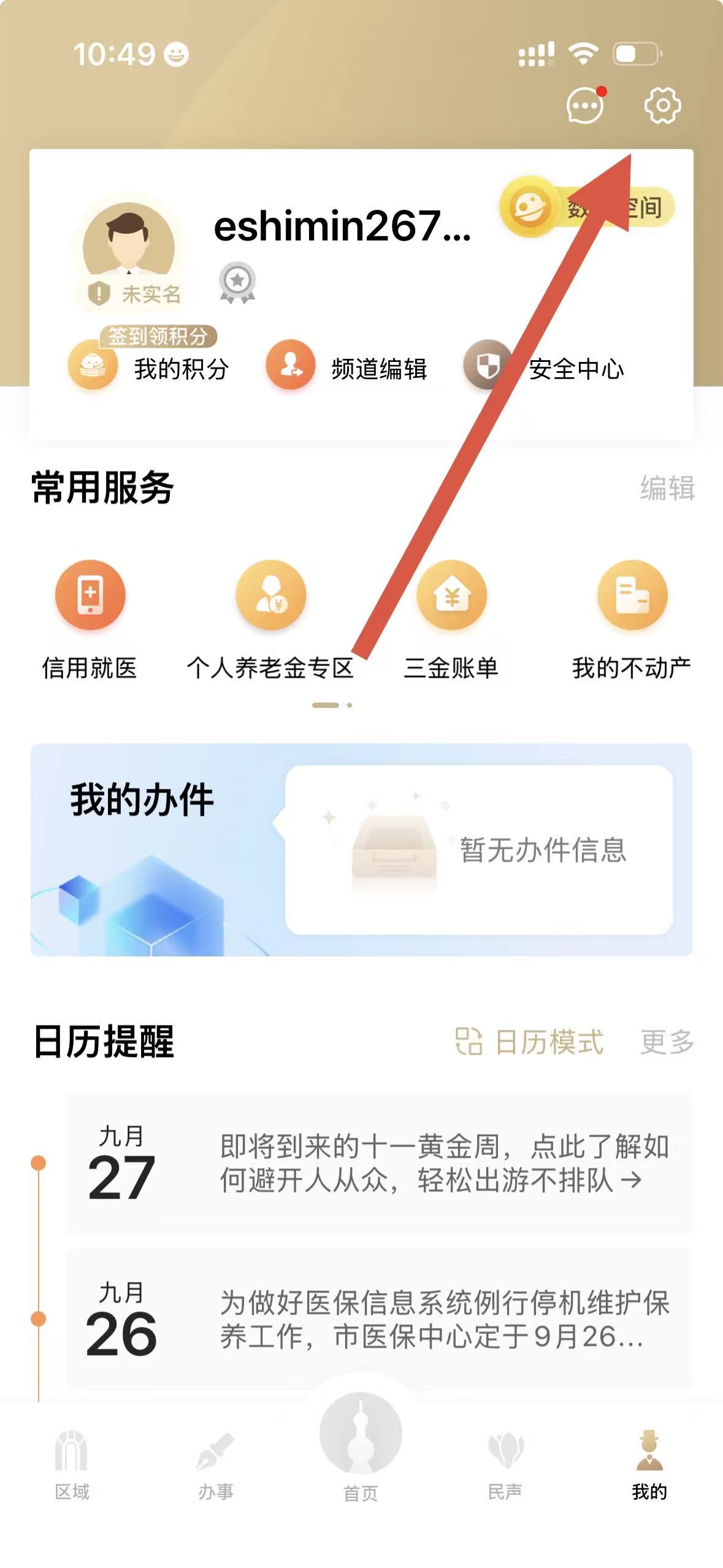 1、打开随申办市民云APP,在我的页面点击右上角设置图标。