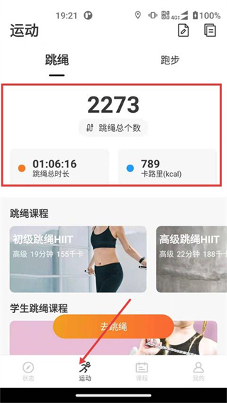 2、支持跳绳、跑步等运动模式,可记录跳绳总个数、时长、消耗卡路里。