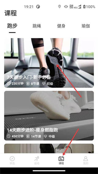 3、提供跑步、跳绳、健身、瑜伽等类别的课程,包含不同阶段的训练内容。