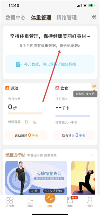 1、打开万步健康,在健康页面的体重管理板块,点击快去记录吧。