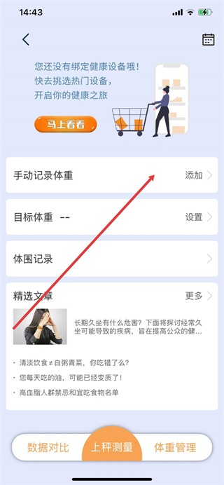 2、进入记录页面后,点击手动记录体重右侧的添加选项。
